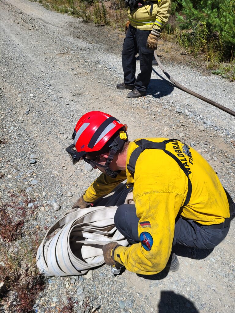Ebenso wurden unsere Mitglieder in die Ausbildungsgruppe eingebunden. Hier wurde mit der Kettensäge sowie Mark 3 (Pumpe) geübt. Es galt aus einem offenen Gewässer Wasser zu entnehmen und die Schlauchleitung zu verlängern. An diesem Tag erfolgte auch der erste Alarm. Zusammen mit drei einheimischen Kräften war man auf einem Löschfahrzeug eingeteilt und machte sich auf den 30 minütigen Weg zum Einsatzort. Dort waren bereits Kräfte der Freiwilligen Feuerwehr vor Ort, so dass man zu einem anderen Einsatz umgeleitet werden konnte. Inklusive Nachlöscharbeiten dauerte der Einsatz 5 Stunden, unsere Kräfte kamen im Erstangriff zum Einsatz. Im Verlauf des Einsatzes wurden auch ein Hubschrauber sowie ein Löschflugzeug eingesetzt.
